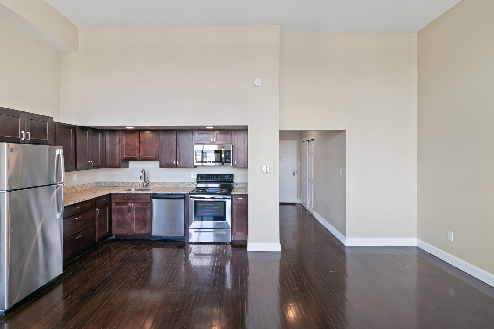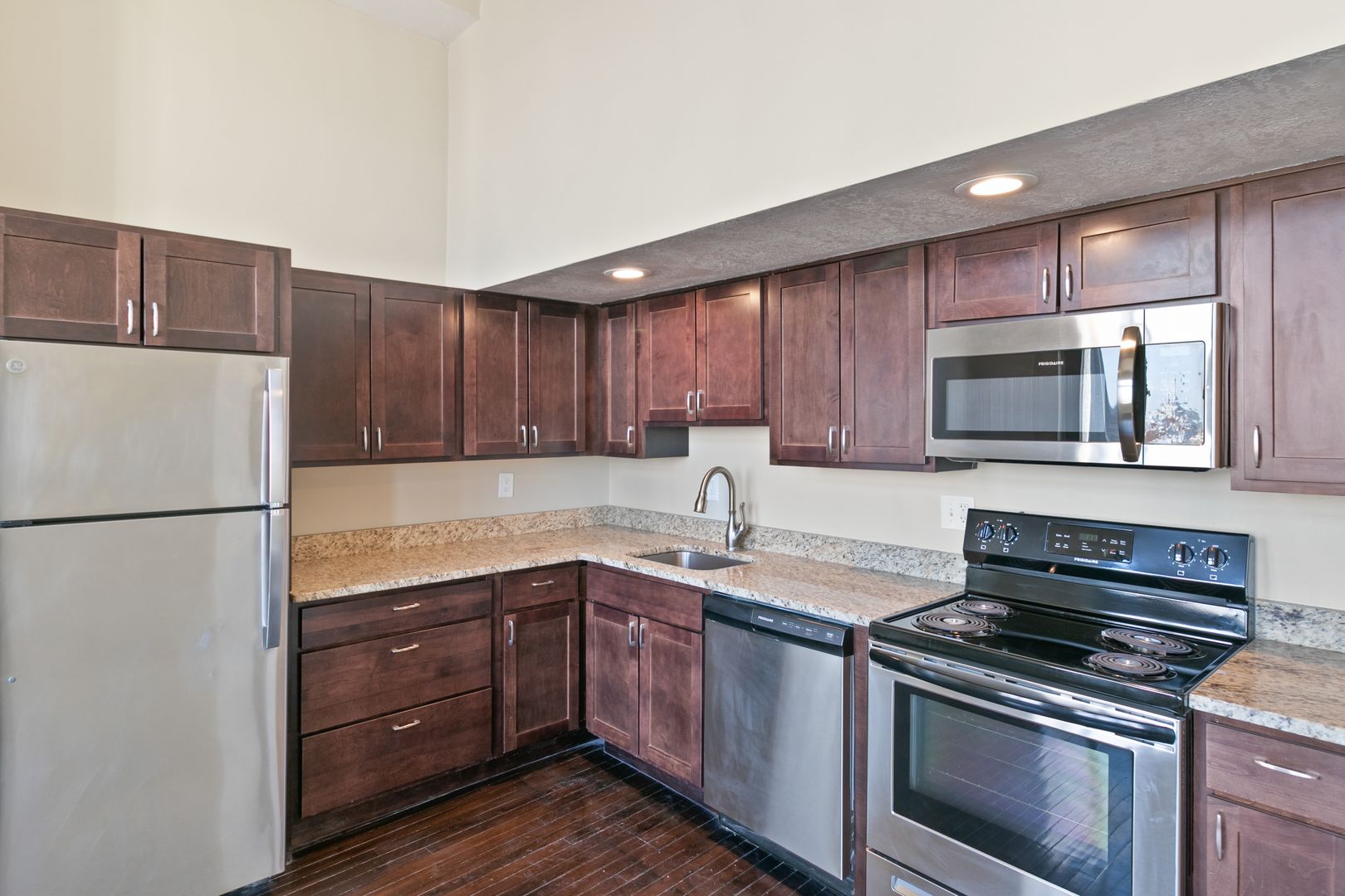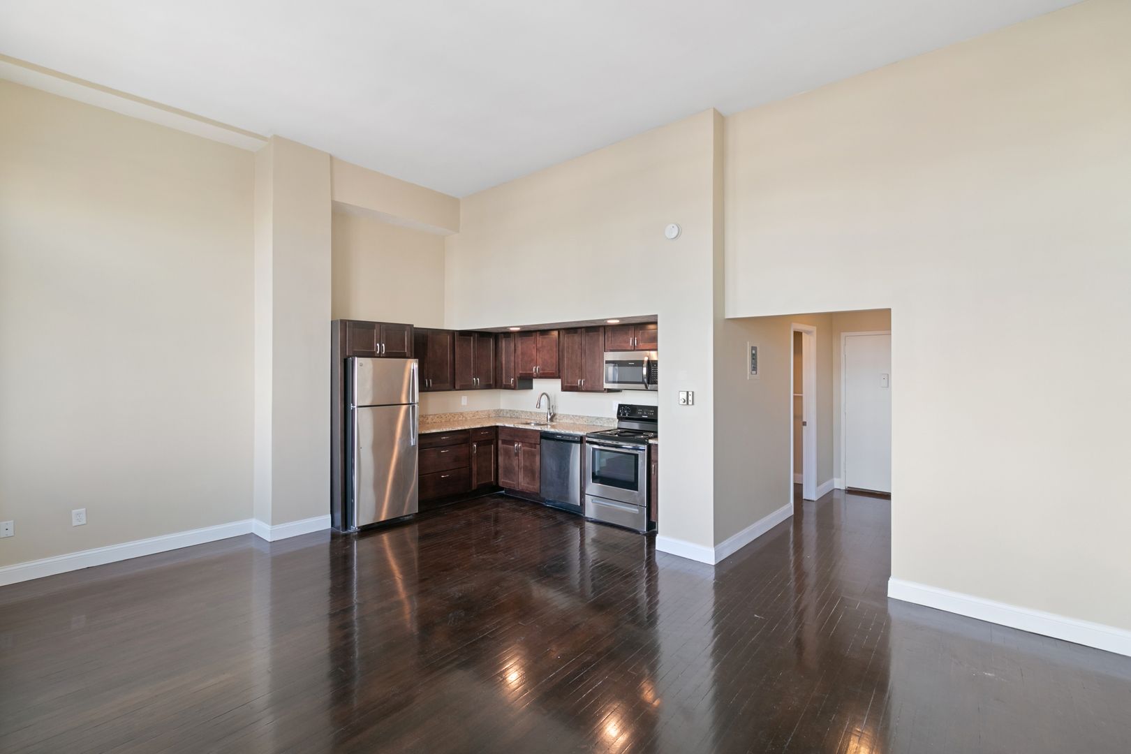 Our largest Studio, One Bathroom Apartment Homes offer thoughtful floor plans, sweeping city views and a central location. Thoughtfully appointed with granite counter tops, stainless steel appliances, goose-neck pull-out faucets, high ceilings* and designer plank flooring.